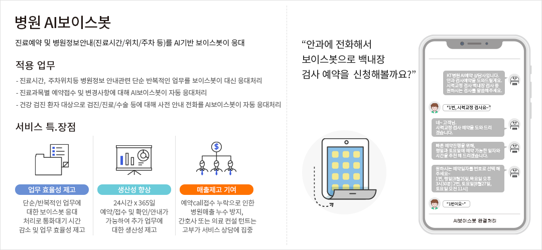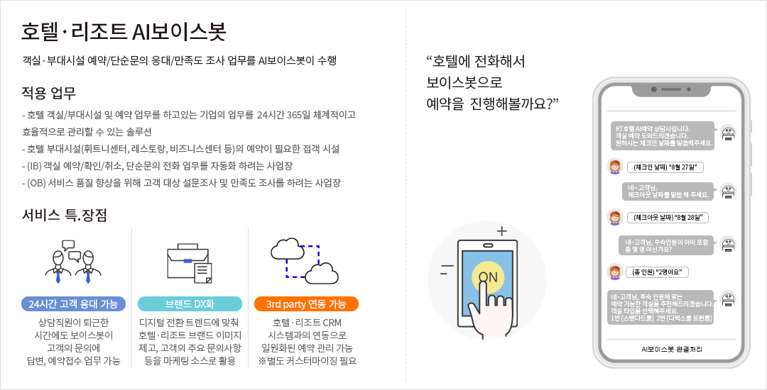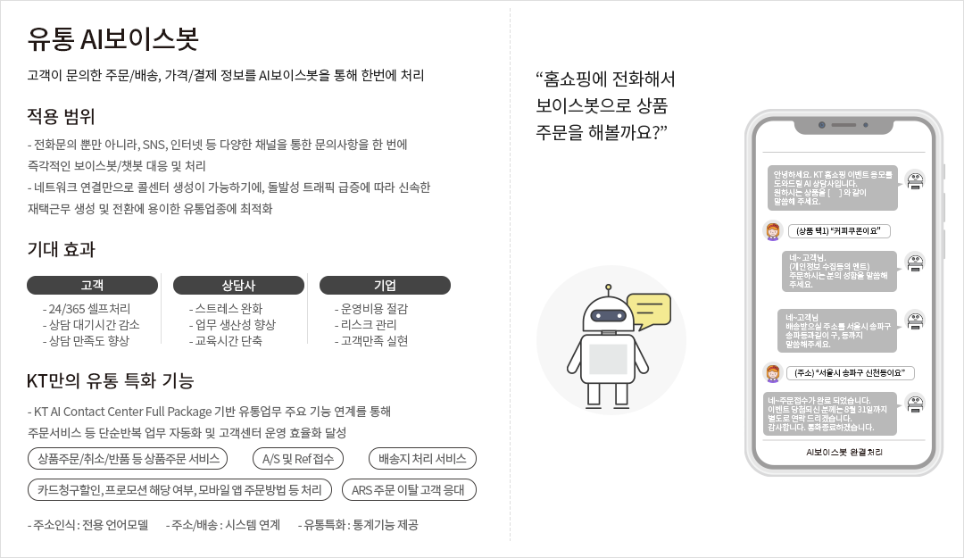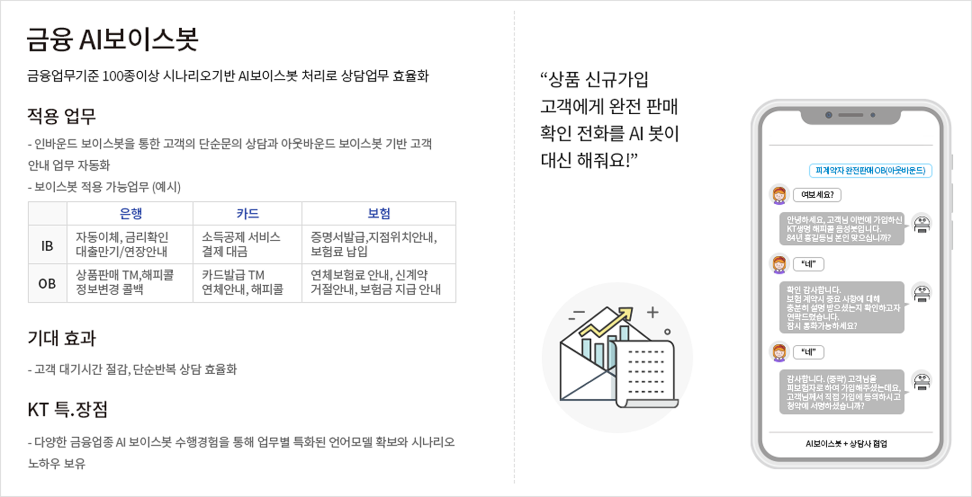 - • KT IS, KT CS와 함께 AI컨택센터의 노하우로 최적화된 상담 서비스를 제공해요